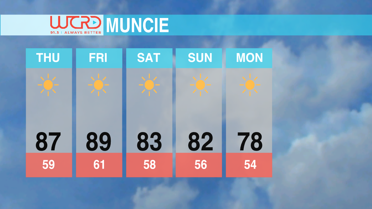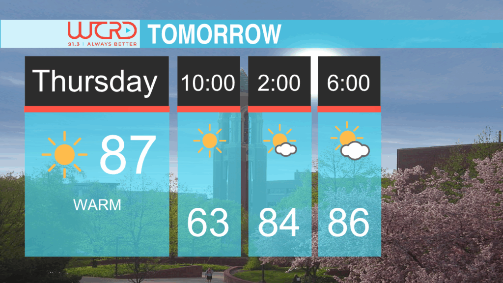 For the next couple of days into the weekend, a high reaching up to 89 degrees on Friday will be the peak of the heat for the rest of the weekend. Clouds pushing in on Saturday will leave the following days with cloudy skies and high of 83 on Saturday and a high of 82 on Sunday. Lows will be in the mid-50s throughout the weekend. Starting the week off on Monday, there will be a high of 78 and a low of 54 with a small chance of rain though it is still vague this far out.