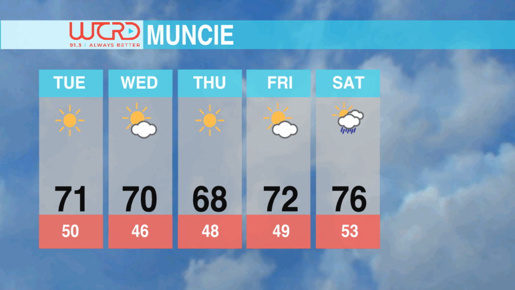 A return to quiet and fall-like weather persists throughout the work week, with temperatures hovering in the lower 70s and perhaps even a day or two with a temperature even below 70. Sunshine will be on full display, with only a few passing clouds each afternoon. Our next chance at rain comes with the passage of a cold front late Saturday.