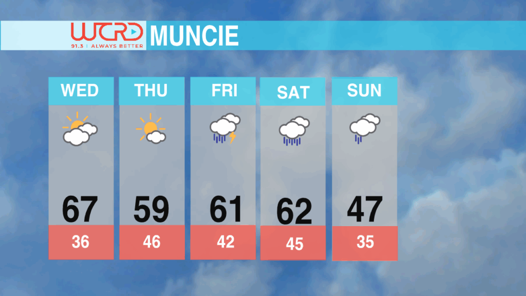 A similar forecast will continue for Thursday, with partly cloudy skies and a high in the high-50’s. But Friday there is a chance of scattered thunderstorms throughout the day. Those rainy clouds will continue into the weekend, and temperatures will stay in the low-60’s to mid-40’s. By Sunday, the scattered showers will continue, and we will see the effect of that cold front with temperatures dropping off to 47 degrees.
