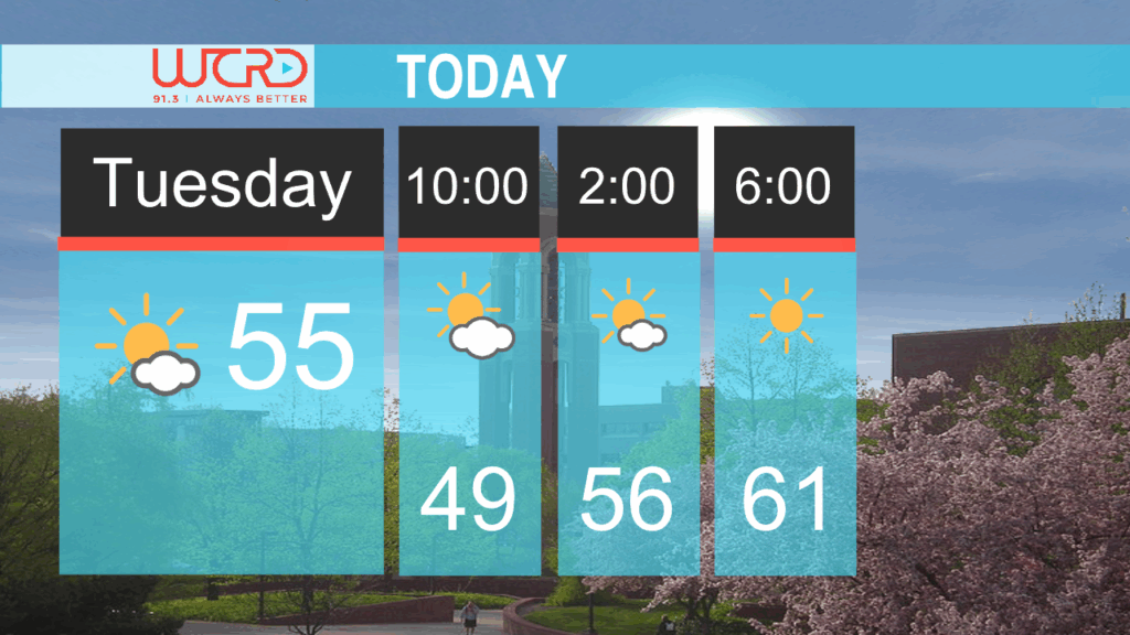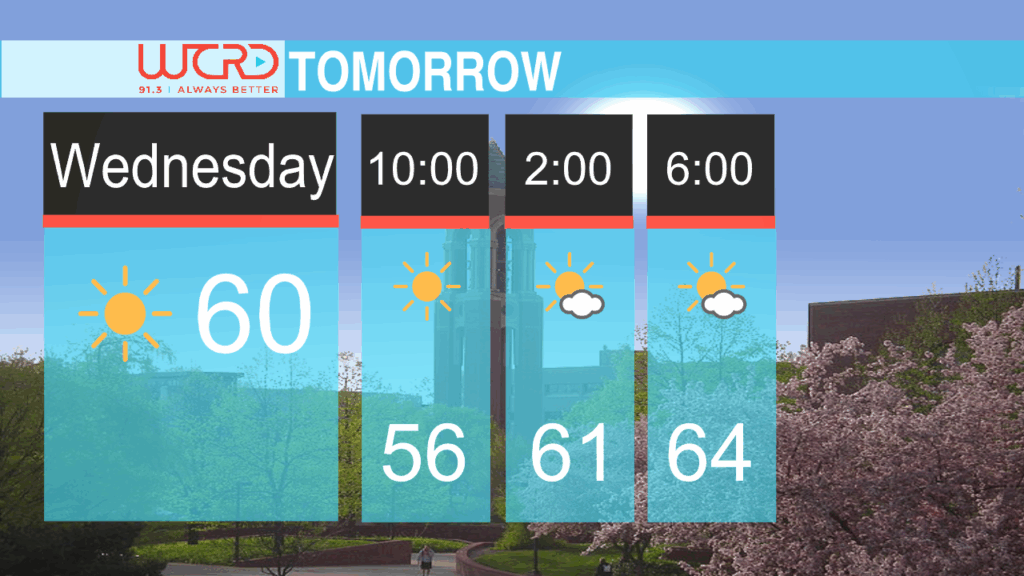 Wednesday will start with a sunny morning at a warm 56 degrees and winds coming in from the southwest at roughly 13mph and gusts up to 25 mph, which may make it feel cooler. That wind is forecasted to continue through the day but thankfully calm down by the evening. A high of 64 degrees will be hit by the afternoon with the clouds slowly moving in later in the day.